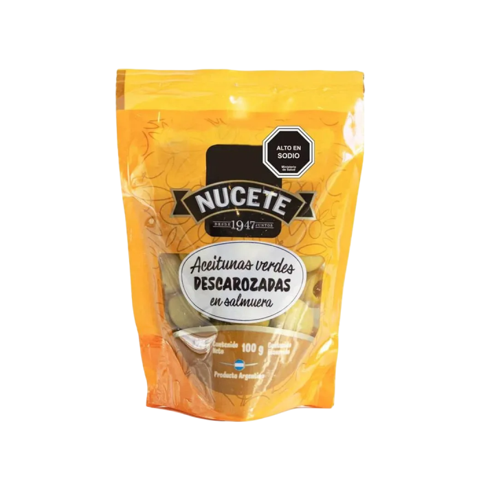 Ingredientes:Aceitunas verdes descarozadas, Agua, Sal, Acidulante ácido láctico, Acidulante ácido cítrico, Conservante sorbato de potasio, Antioxidante ácido ascórbico.