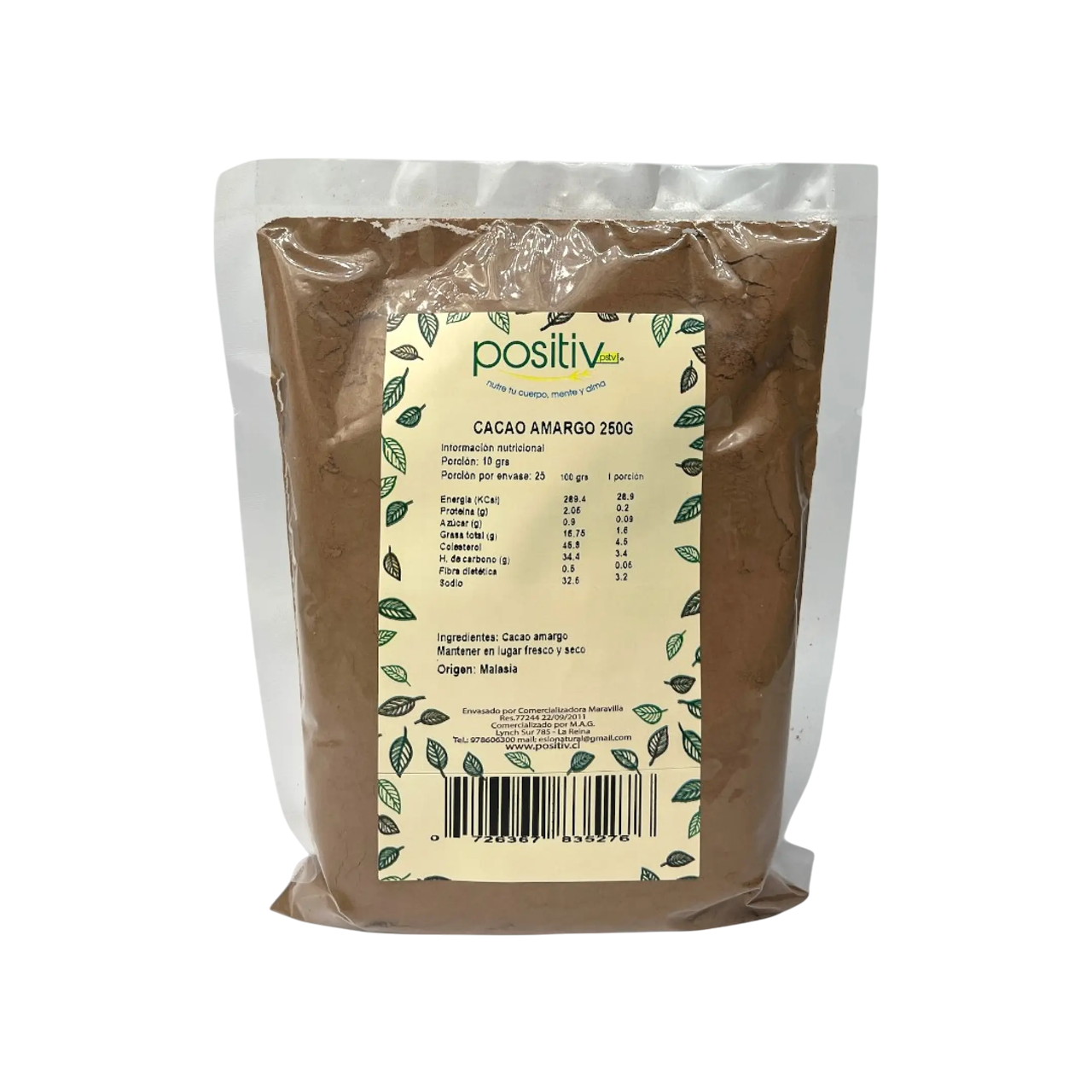 Ingredientes: Cacao Amargo. Puede contener trazas de gluten, soya, frutos secos y sus derivados.