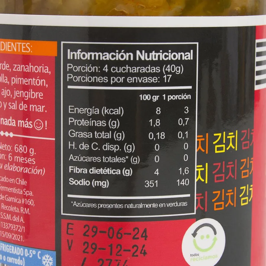 Ingredientes: Repollo verde, Zanahoria, Kale, Cebolla, Pimentón, Cebollín, Ajo, Jengibre, Ají chileno, Sal de mar.