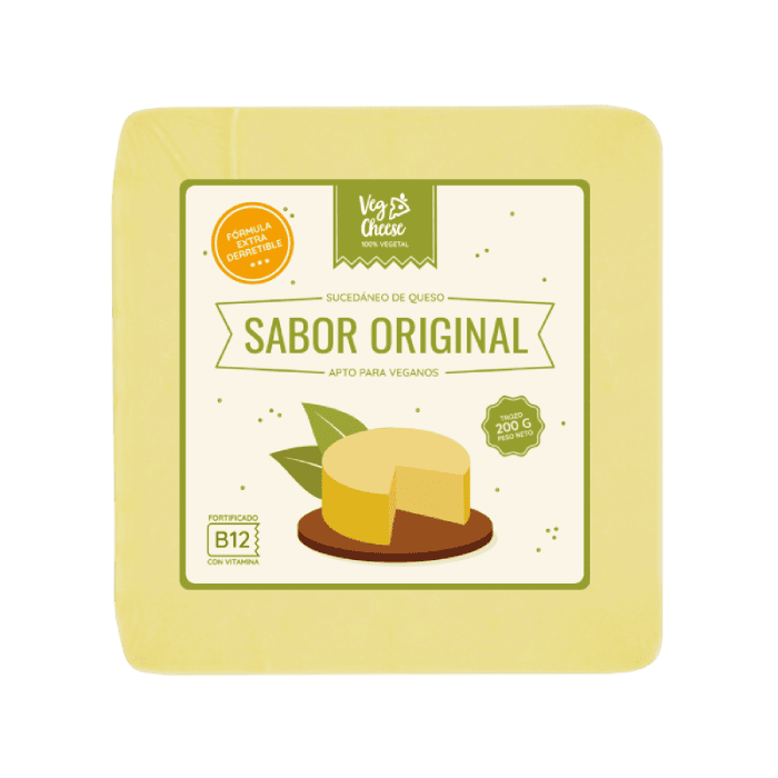 Ingredientes: Agua, aceite de palma (23%), almidón modificado, sal de mar, saborizante natural vegano de queso mozzarella, colorante: β-caroteno, sorbato de potasio y vitamina B12